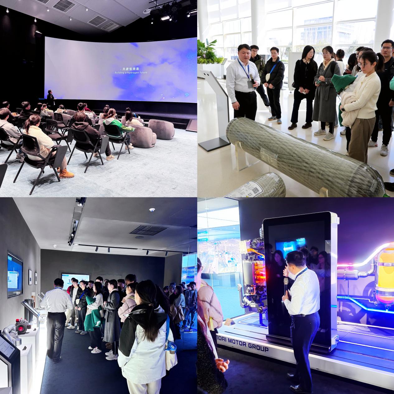 在氢能产业园中心展厅,由讲解员的带领下,同学们依次参观了“氢之重”、“氢之舞”、“氢之能”等展厅。了解了氢能发展的重要意义、企业科技创新成果及氢能的广阔前景。展厅涵盖了氢能制、储、运、加、用全产业链。由产业链上游的电解槽及其关键部件,到中游的储氢、输氢,再到产业链下游的加氢站,燃料电池车。同学们见到了实验中熟悉的膜电极、双极板,也被“由实验室到工业化”的跳跃所震撼。