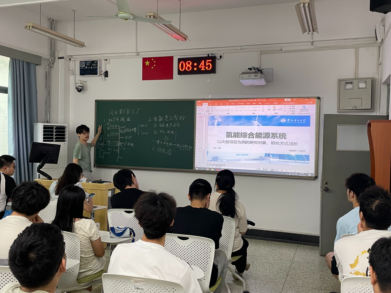 值得一提的是,在氢能综合能源系统实验的理论教学环节,采用了“反转课堂”的教学模式,由氢能2201班长方桢担任主讲,向同学们讲解氢能综合能源系统的原理与应用。这种创新的教学方式不仅激发了学生的学习热情,也培养了他们的表达能力和专业自信。